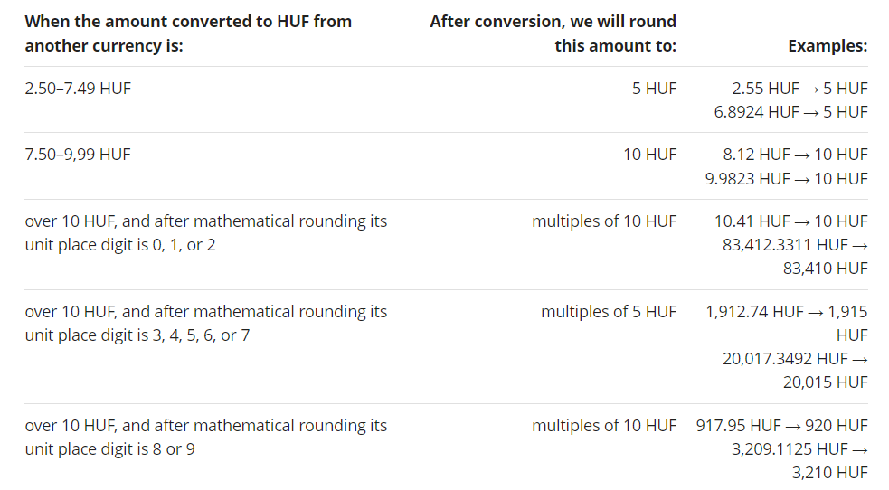 When converting from another currency into HUF, we start by rounding the result to the whole amount, and later to the nearest multiple of 5 HUF. We do it in accordance with detailed rules: