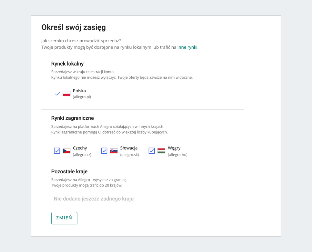 - Zaznacz rynki, na których chcesz sprzedawać – w tym allegro.cz. Rynek, na którym masz zarejestrowane konto, zawsze będzie zaznaczony i nie możesz tego zmienić.